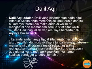 Dalil aqli terdiri dari kata dalil dan aqli yang bermakna akal dari bahasa Arab. Namun Diantara Mereka Tidak Ada Perbedaan Dalam Hal Menyeru Kepada Tauhid. Dalil Naqli bukti yang berasal dari salinan Al-Quran dan Al-Hadis.